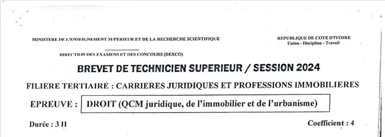 BTS CJPI DROIT(QCM Juridique , de l'immobilier et de l'Urbanisme) Session 2024