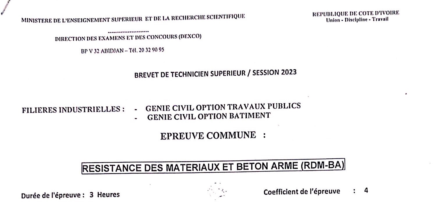 BTS GTP RESISTANCE DES MATERIAUX ET BETON ARME Session 2023