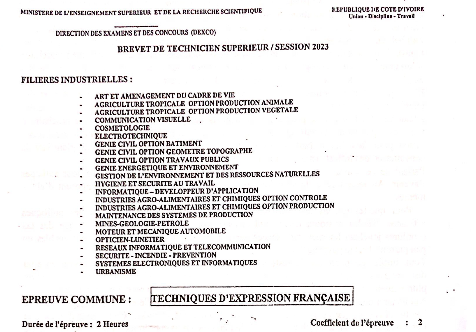 BTS SEI TECHNIQUES DEXPRESSION FRANCAISE Session 2023