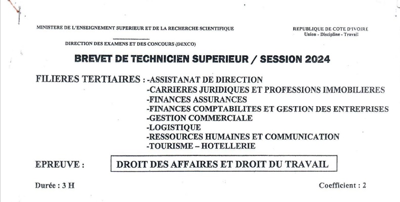 BTS FCGE DROIT DES AFFAIRES ET DROIT DU TRAVAIL Session 2024