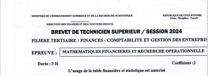 BTS FCGE MATHEMATIQUES FINANCIERES ET RECHERCHE OPERATIONNELLE Session 2024