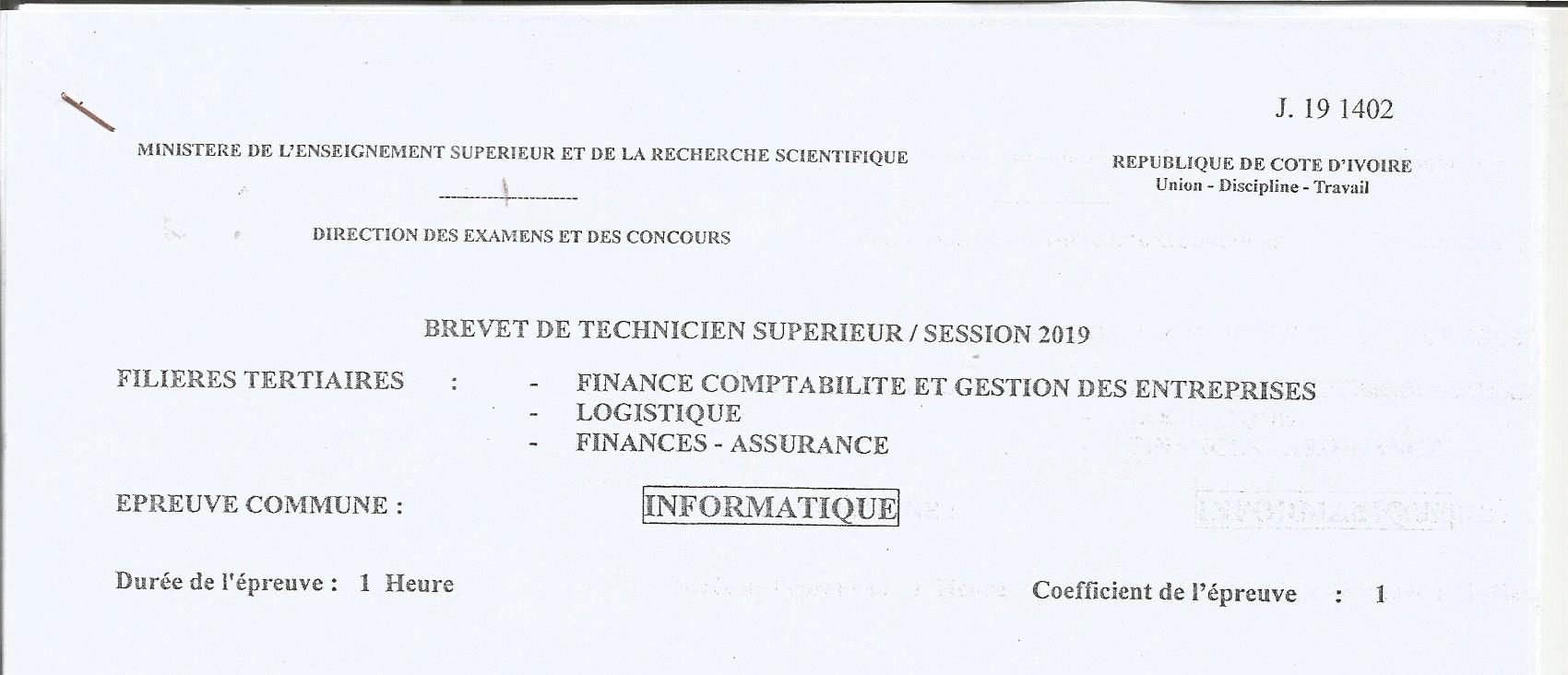 BTS FCGE INFORMATIQUE Session 2019