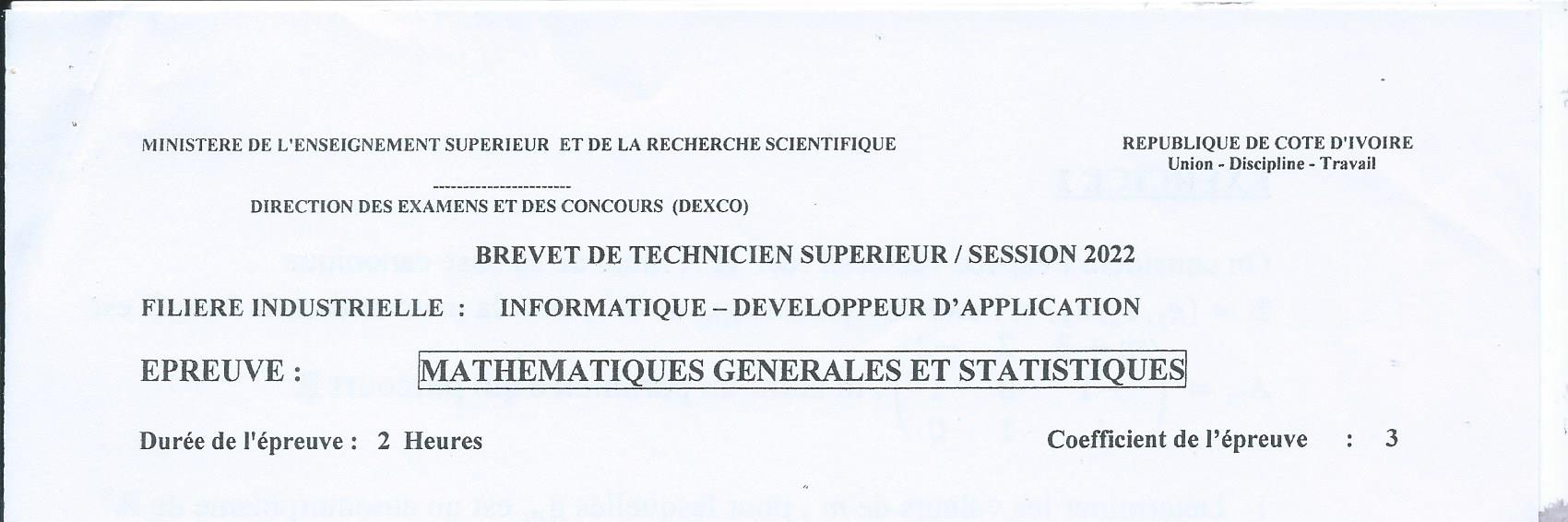 BTS IDA MATHEMATIQUES Session 2022