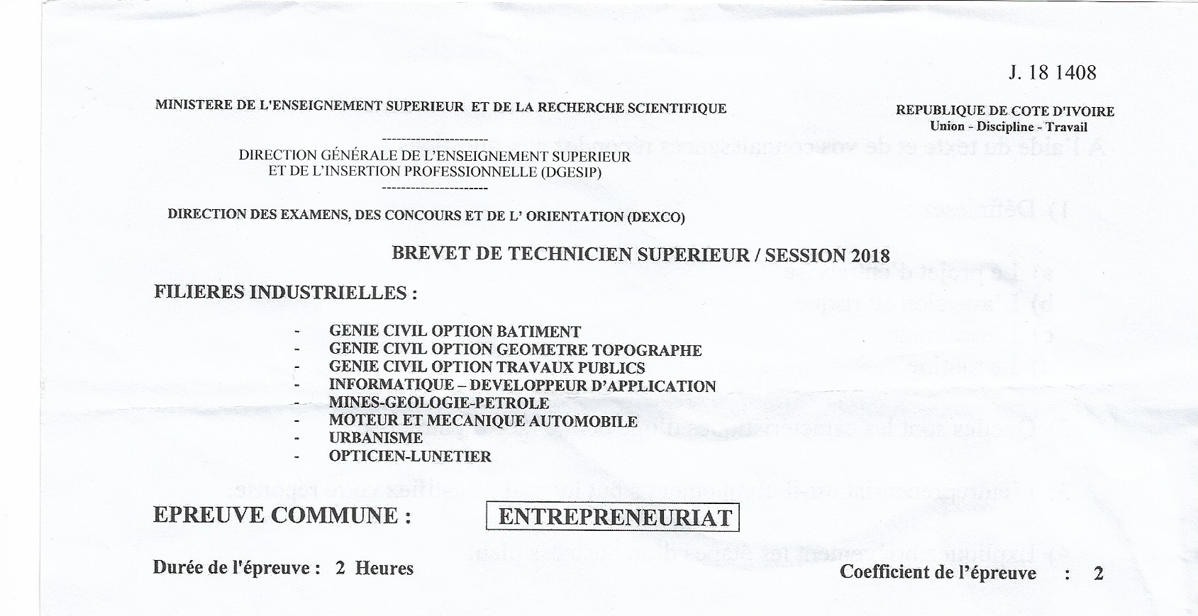 Sujets - GENIE CIVIL OPTION BATIMENT / ENTREPRENEURIAT