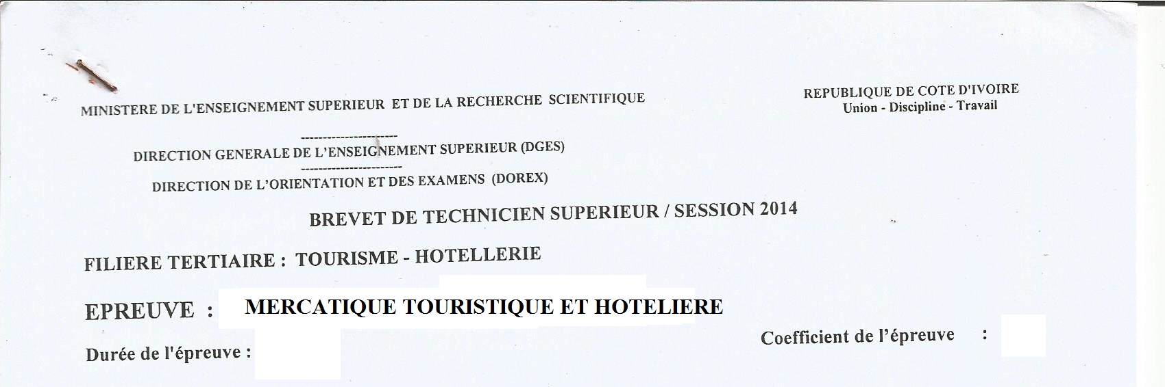 BTS TH MERCATIQUE TOURISTIQUE ET HOTELIERE Session 2014