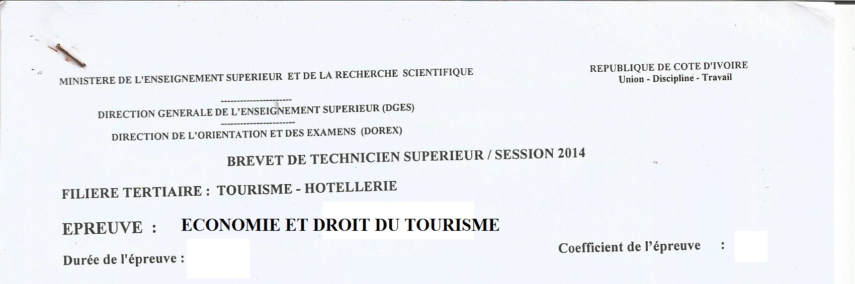 BTS TH ECONOMIE ET DROIT DU TOURISME Session 2014