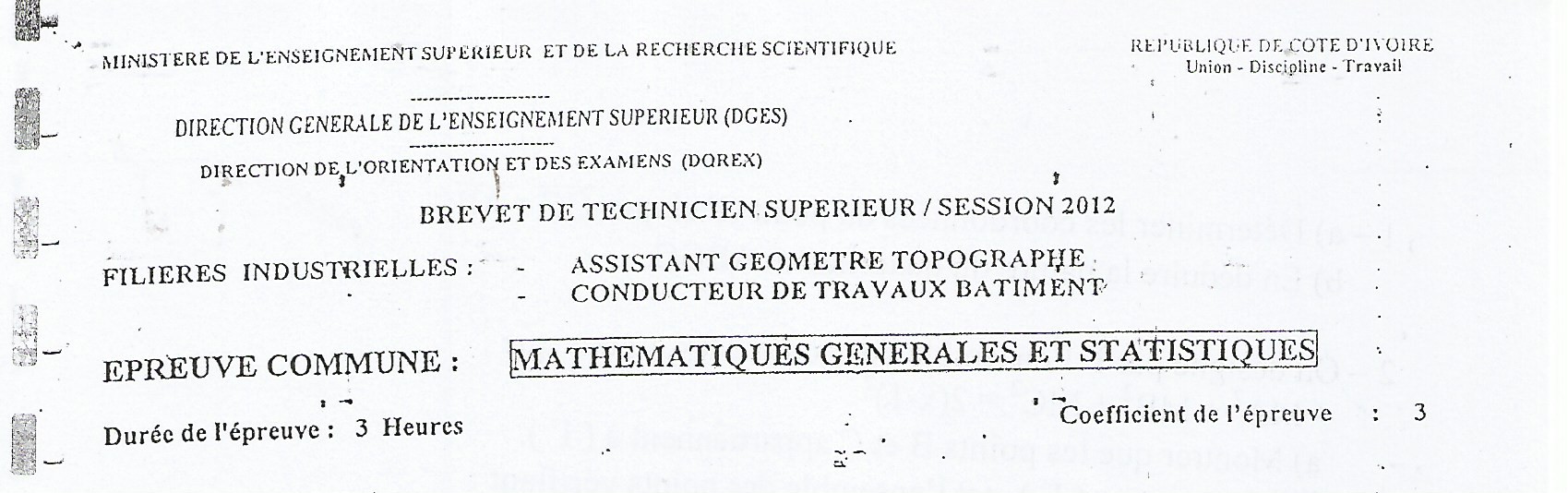 Sujets - ASSISTANT GEOMETRE TOPOGRAPHE / MATHEMATIQUES GENERALES ET STATISTIQUES