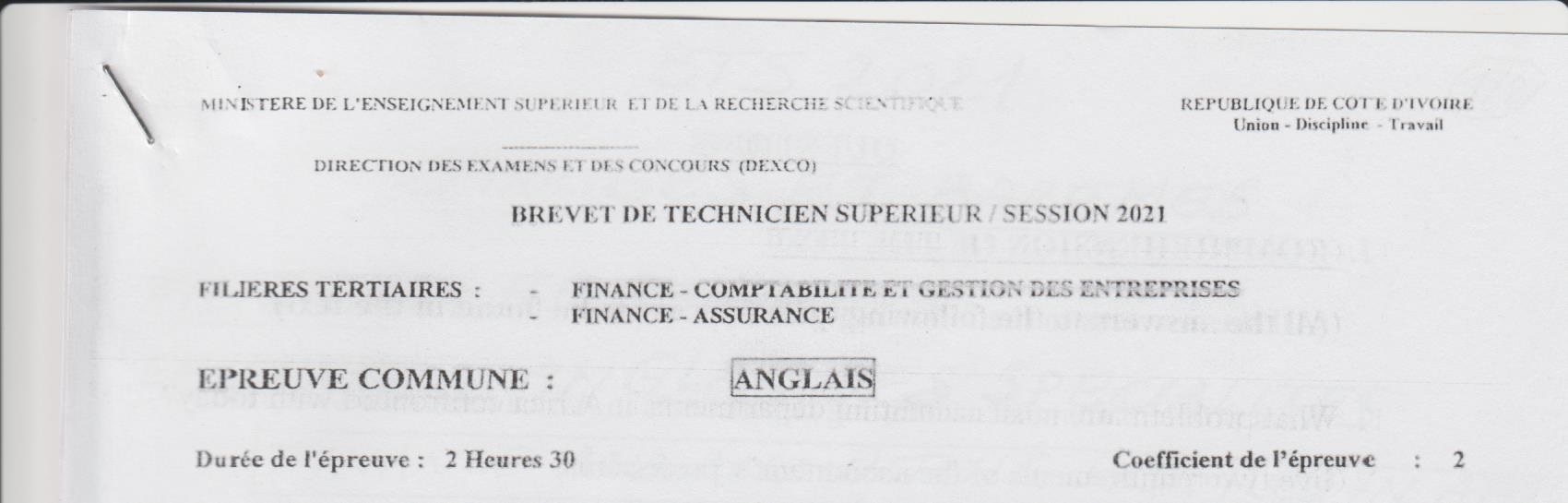 Sujets - FINANCE ASSURANCE / ANGLAIS