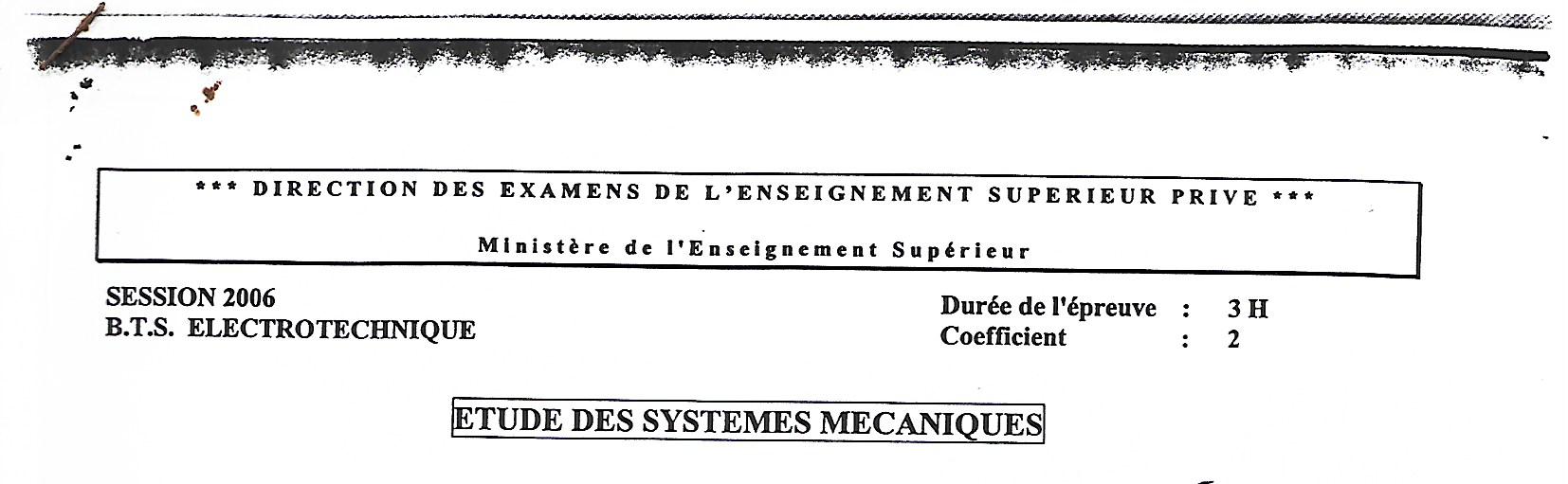 BTS ELEC ETUDE DES SYSTEMES MECANIQUES Session 2006