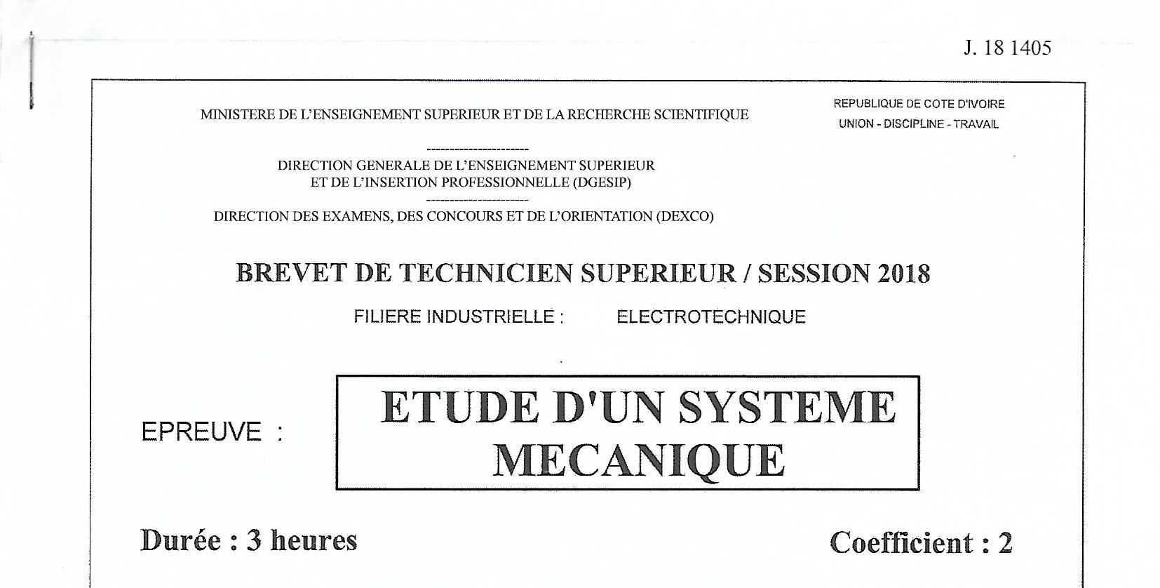 BTS ELEC ETUDE DES SYSTEMES MECANIQUES Session 2018
