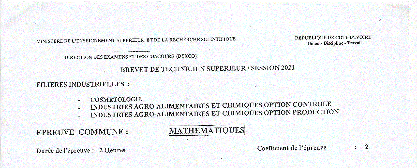 BTS COSM MATHEMATIQUES Session 2021