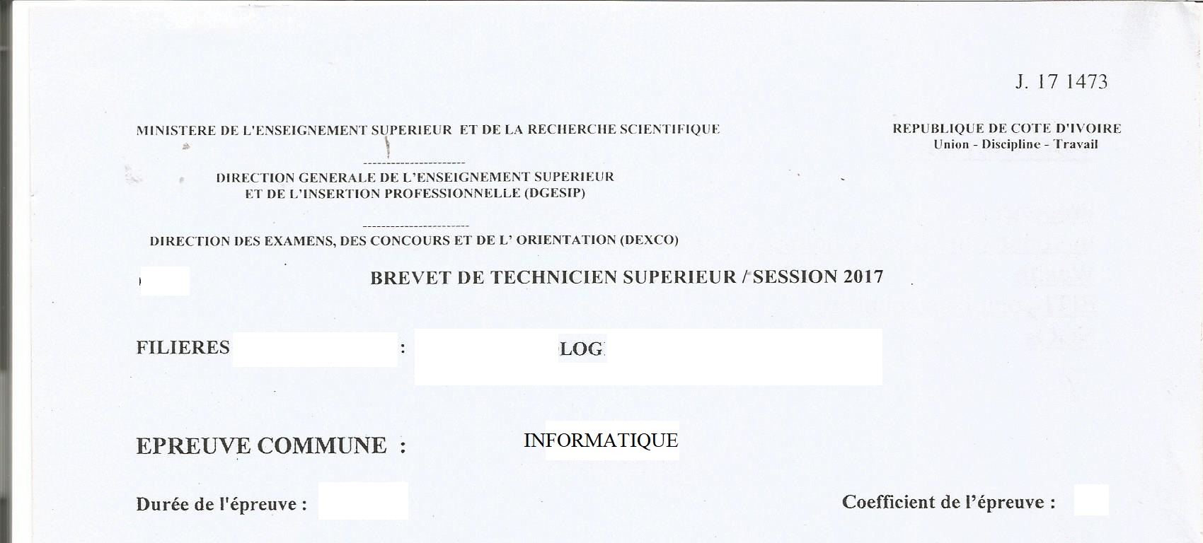 BTS LOG INFORMATIQUE Session 2017