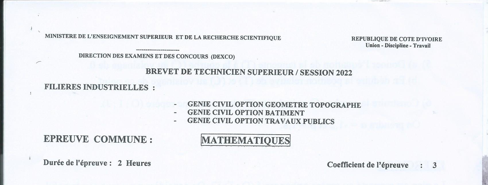 BTS GGT MATHEMATIQUES Session 2022
