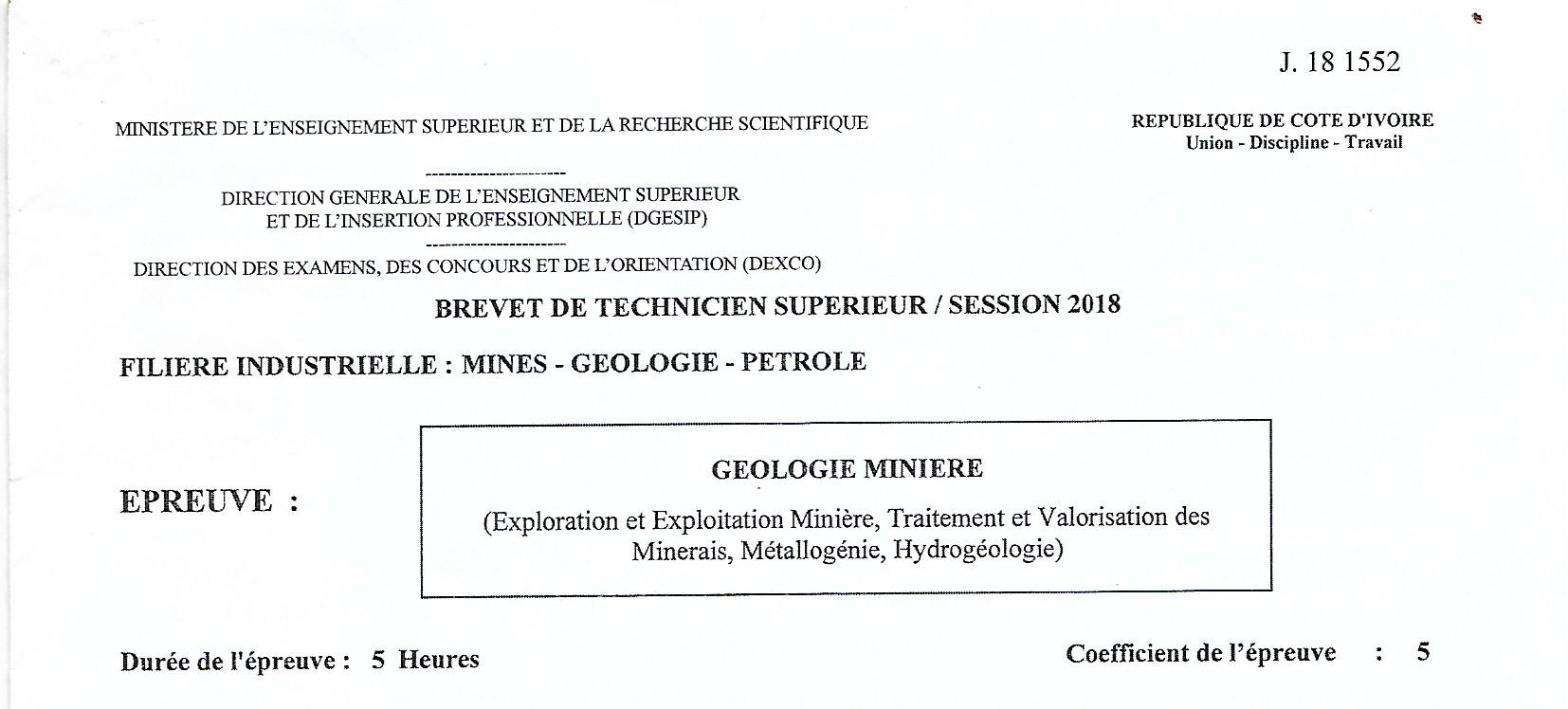 BTS MGP GEOLOGIE MINIERE Session 2018