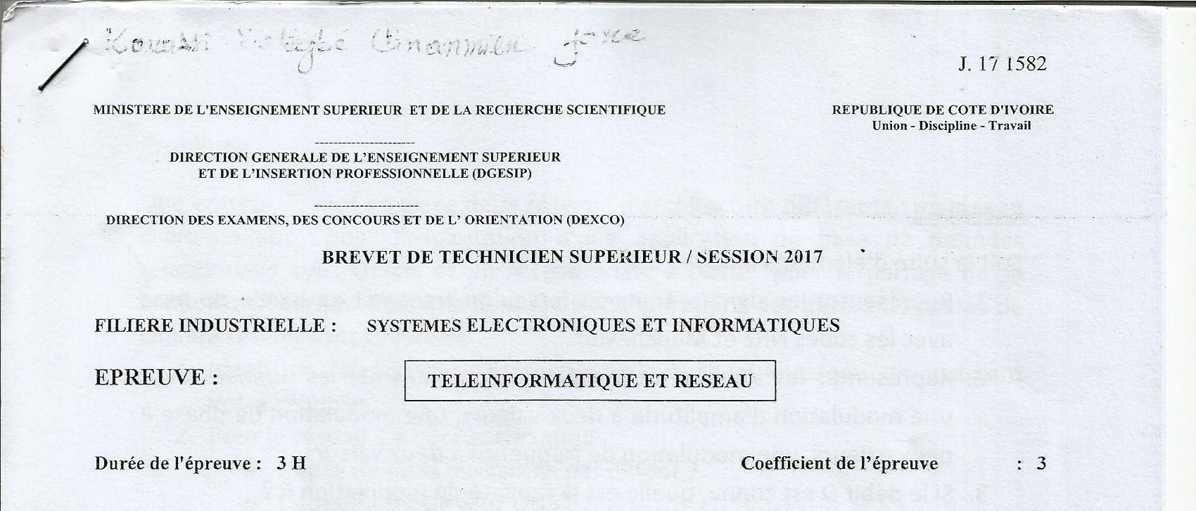 BTS SEI TELEINFORMATIQUE ET RESEAU Session 2017