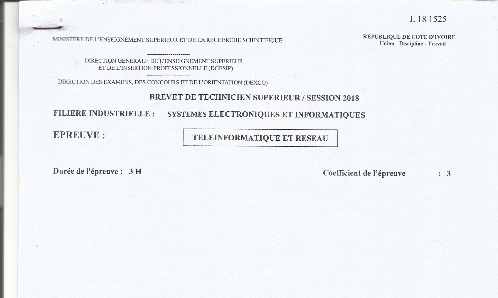 BTS SEI TELEINFORMATIQUE ET RESEAU Session 2018